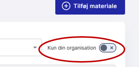 - Når du skal tildele en borger/patient materiale fra kataloget, så brug den lille knap i øverste højre hjørne – ’Kun din organisation’. Når denne er ’tændt’, ser du kun det materiale, der er uploadet fra personer i din egen organisation.